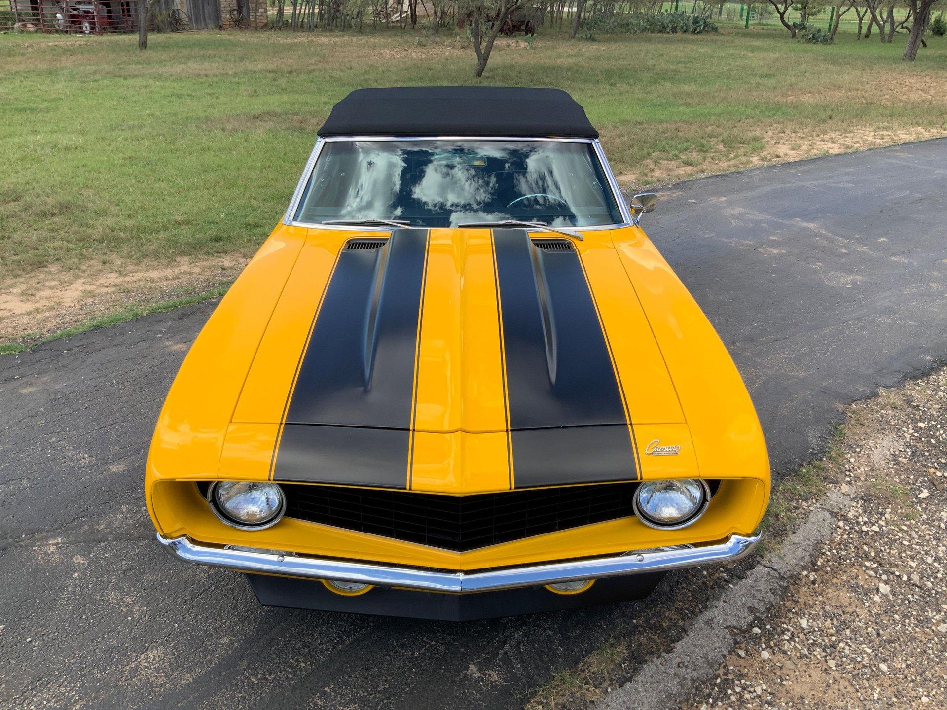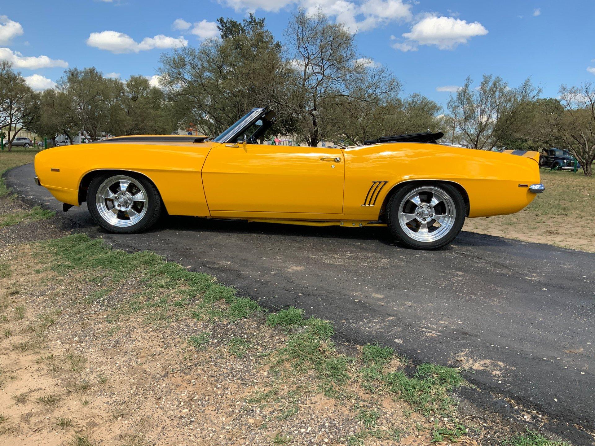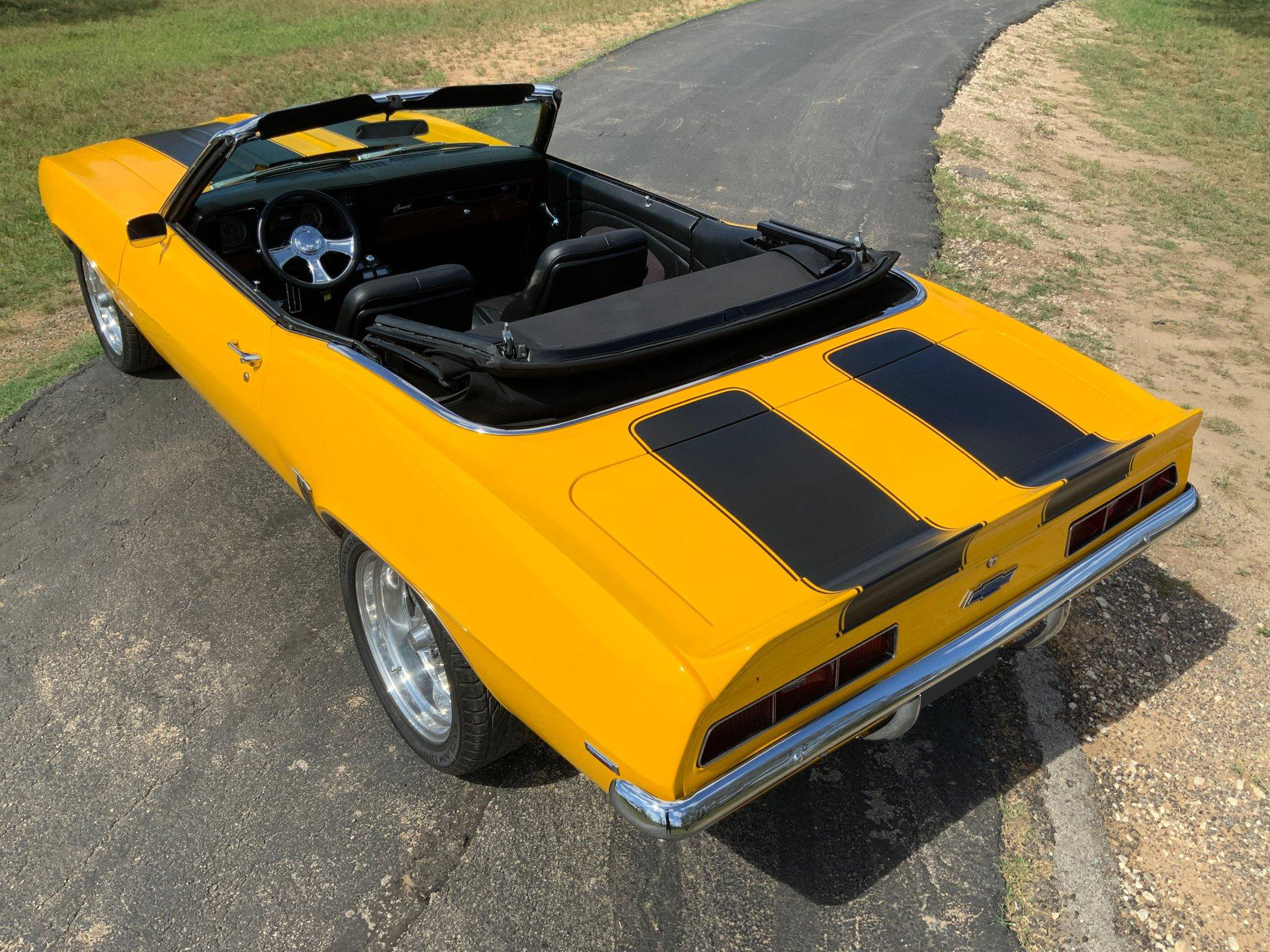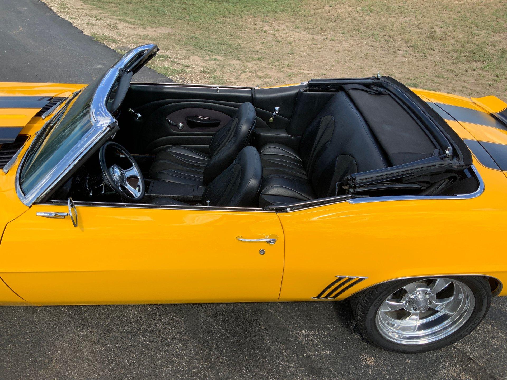 This wicked 1969 Camaro Convertible definitely leans toward the stoplight stormer type, but it does so with vastly increased performance and safety. Lift the functional steel "super scoop" hood and you'll be greeted by a ferocious GMPP 502 V8 that's sporting forged internals, a hydraulic roller cam, a Holley carburetor, a GMPP aluminum intake manifold, aluminum heads, and a Mallory billet distributor. Additional features include a tubular steel front subframe with coilovers and power rack and pinion steering, power 4-wheel disc brakes, 5-speed manual transmission with HD scatter shield, 4-link rear end with coilovers, front and rear stabilizer bars, tubular steel subframe connectors, custom interior, tilt steering column with custom wheel, console with gauges, an Alpine AM/FM/CD audio system, and Billet Specialties alloy wheels wearing aggressive rubber (245/45ZR17 F, 275/40ZR18 R). This beast takes the Camaro nickname "the Hugger", as in road hugger, seriously and one look at the chassis in the images provided explains why.