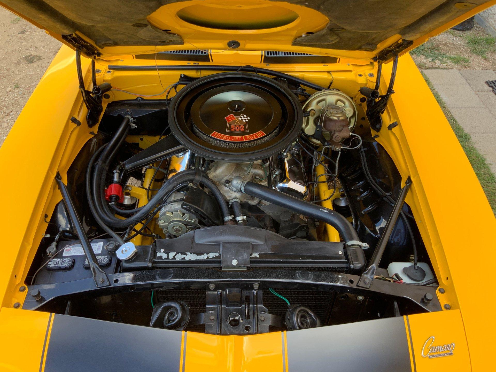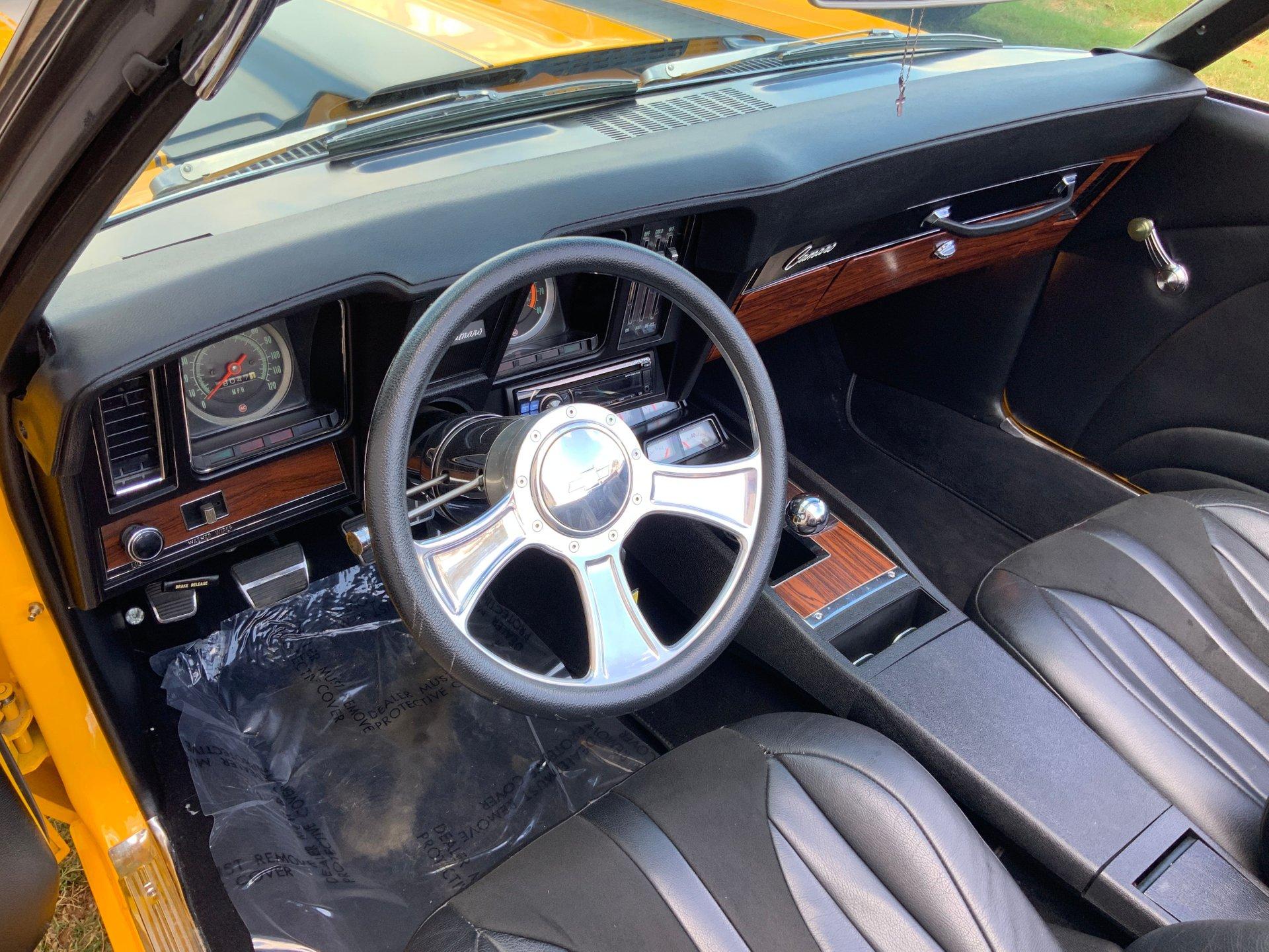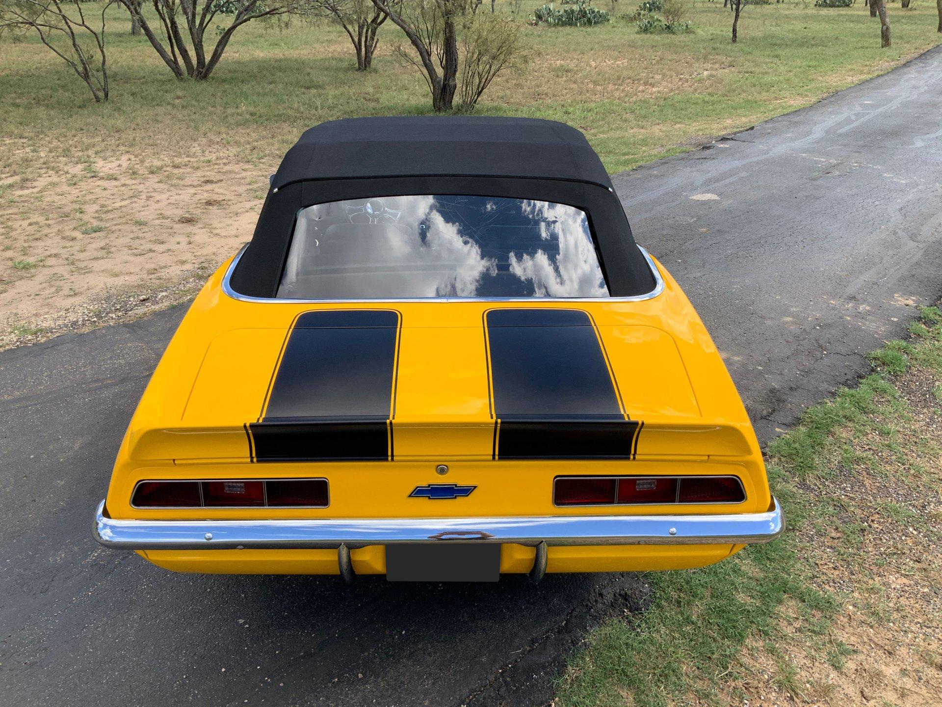 This wicked 1969 Camaro Convertible definitely leans toward the stoplight stormer type, but it does so with vastly increased performance and safety. Lift the functional steel "super scoop" hood and you'll be greeted by a ferocious GMPP 502 V8 that's sporting forged internals, a hydraulic roller cam, a Holley carburetor, a GMPP aluminum intake manifold, aluminum heads, and a Mallory billet distributor. Additional features include a tubular steel front subframe with coilovers and power rack and pinion steering, power 4-wheel disc brakes, 5-speed manual transmission with HD scatter shield, 4-link rear end with coilovers, front and rear stabilizer bars, tubular steel subframe connectors, custom interior, tilt steering column with custom wheel, console with gauges, an Alpine AM/FM/CD audio system, and Billet Specialties alloy wheels wearing aggressive rubber (245/45ZR17 F, 275/40ZR18 R). This beast takes the Camaro nickname "the Hugger", as in road hugger, seriously and one look at the chassis in the images provided explains why.