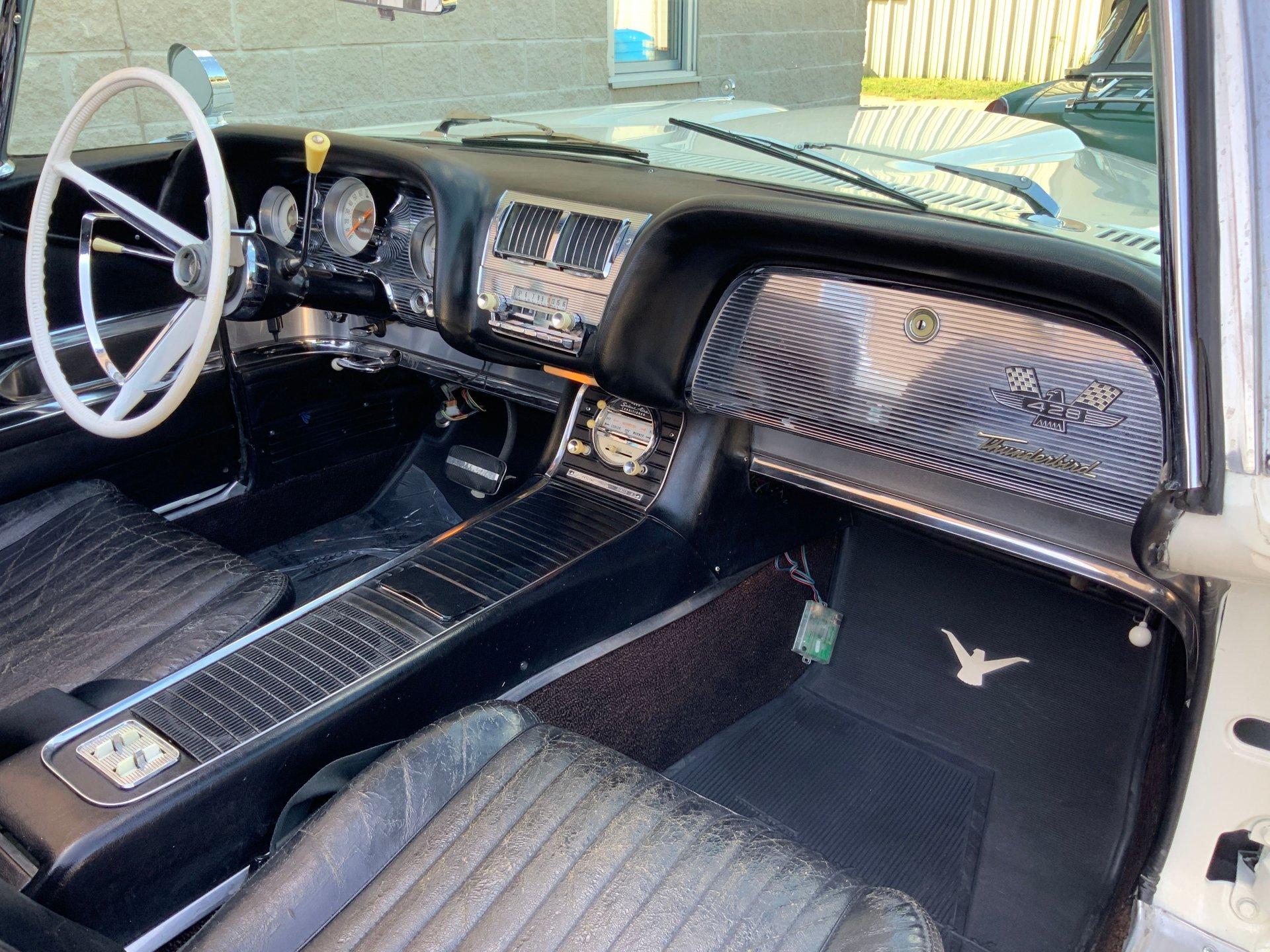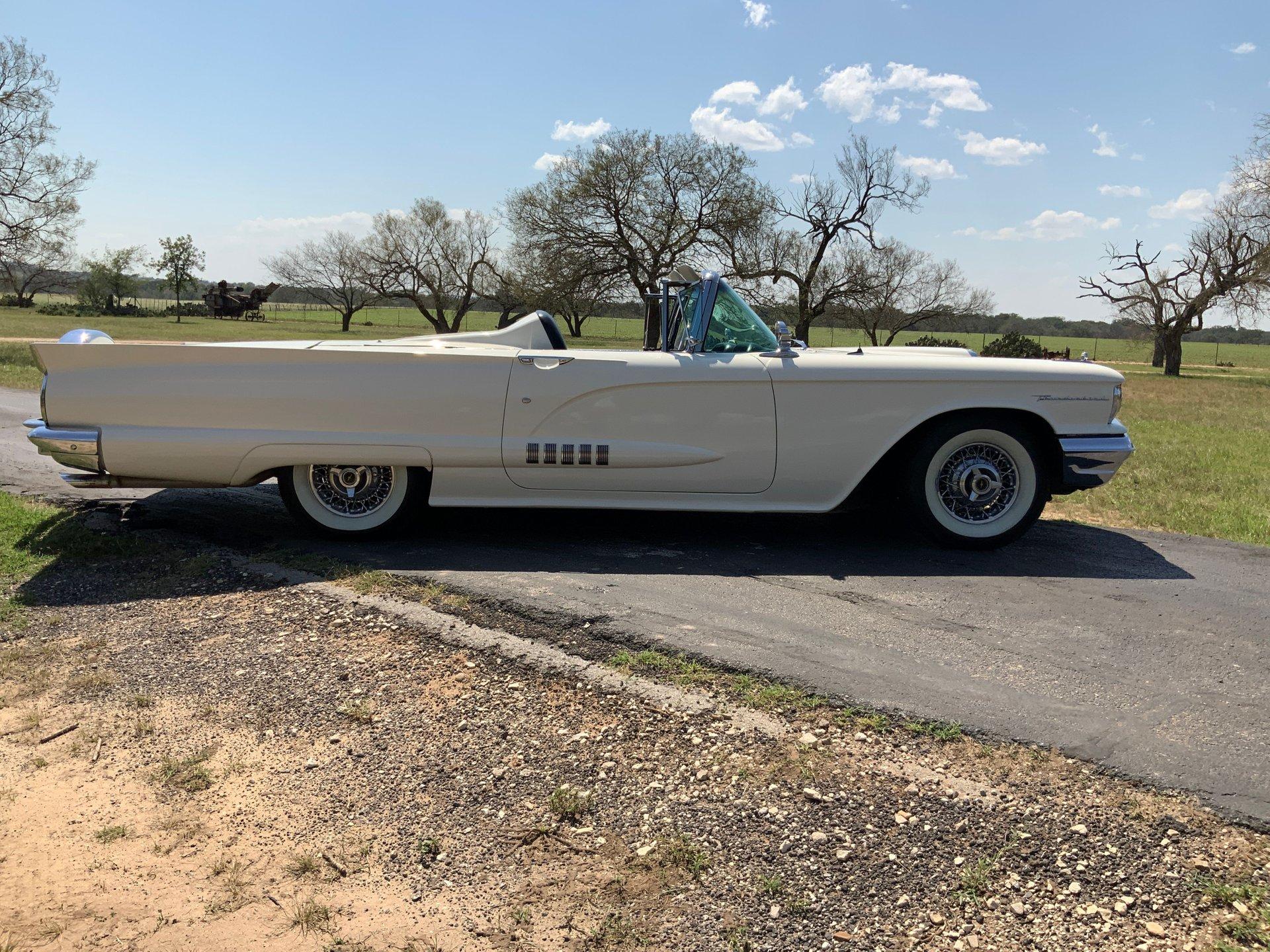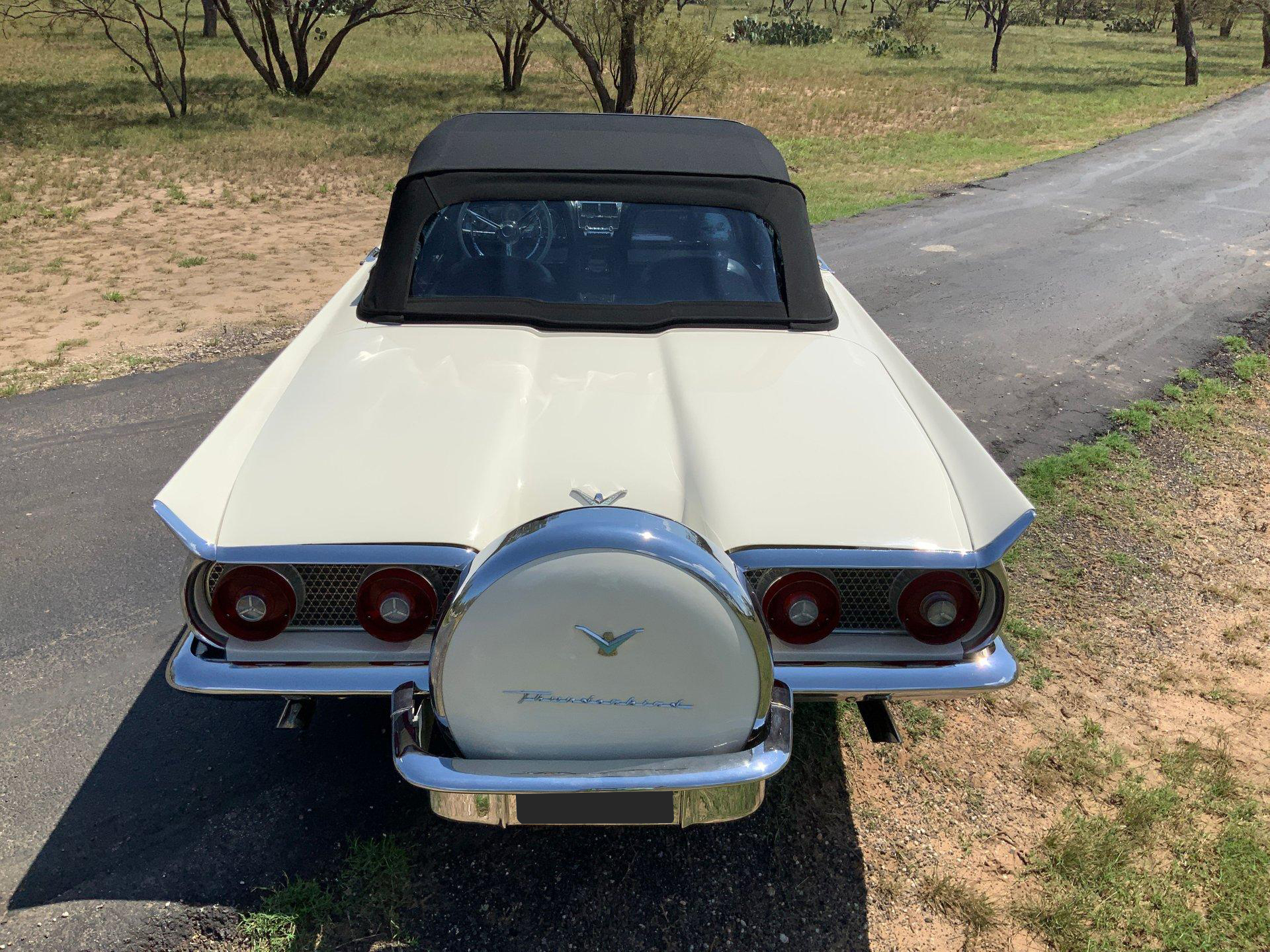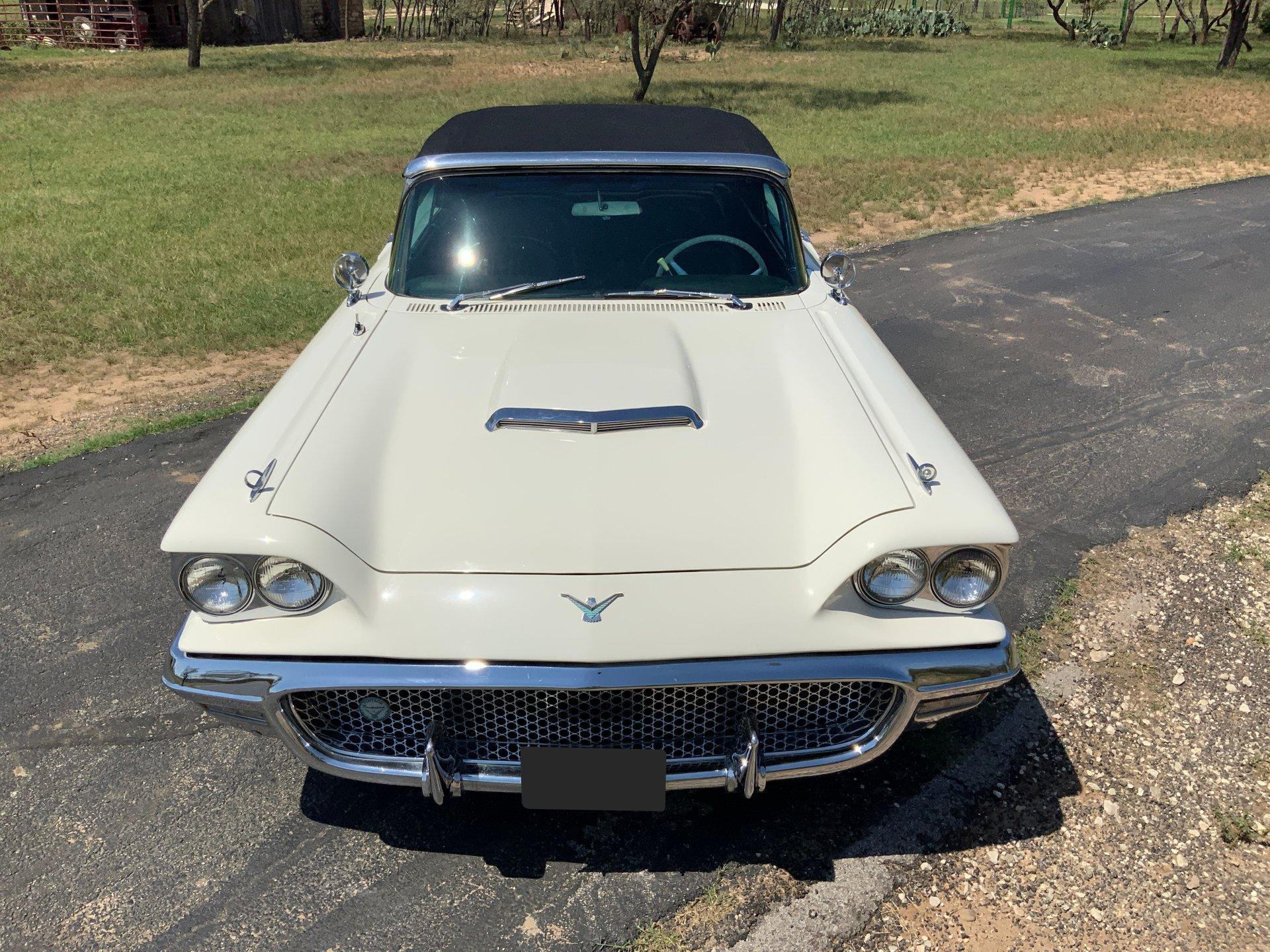 This Winterset White (B) 1958 Ford Thunderbird was actually the first 4-seat T-Bird, and the marketing department started using the term "personal luxury" vehicle. Lift the classic and functional scooped hood and you'll be greeted by a torque rich Ford 428 V8 that was swapped for the original 352. Additional features include power steering, power front disc brakes, power windows, power seats, power top, air conditioning, a stout C6 automatic transmission, dual exhaust, classy Continental Kit, console, new Haartz cloth top, fiberglass tonneau from the 1962 Sports Roadster, and wide whitewall tires (215/75R14) wrapped around Kelsey-Hayes-type wire wheels. This classic cruiser has plenty of power for highway driving and possesses more character in a single fender than a new car has in its entirety.