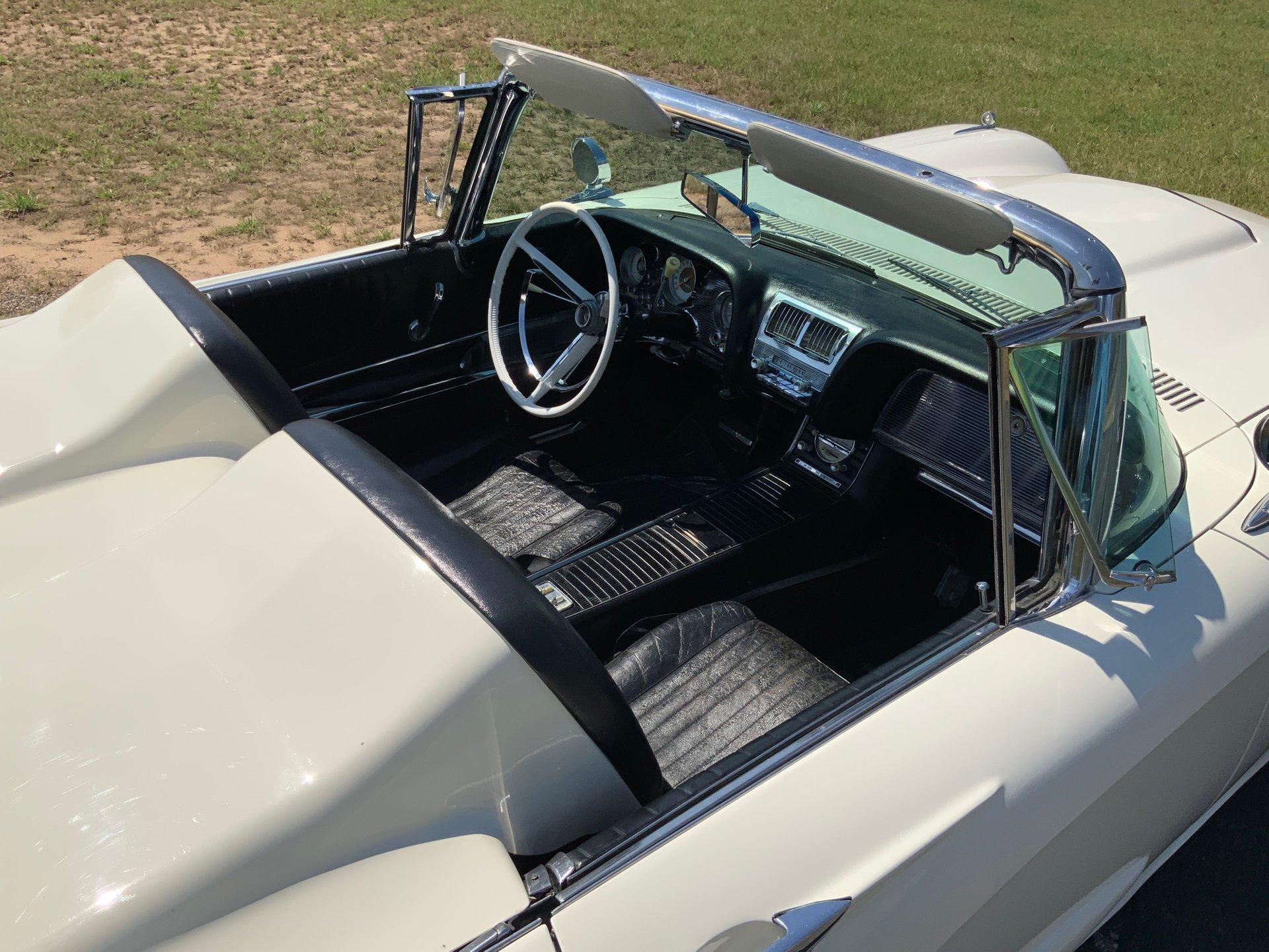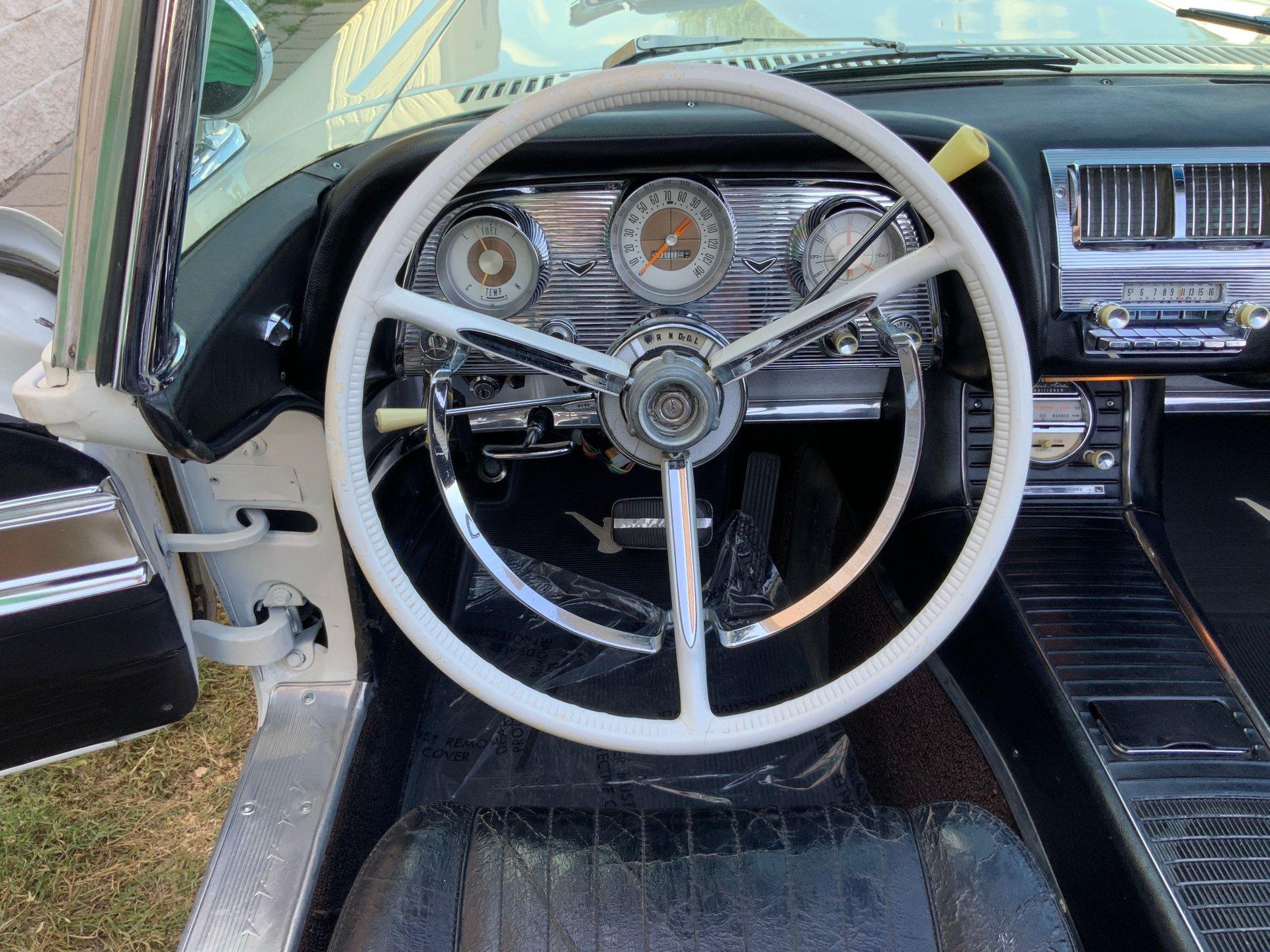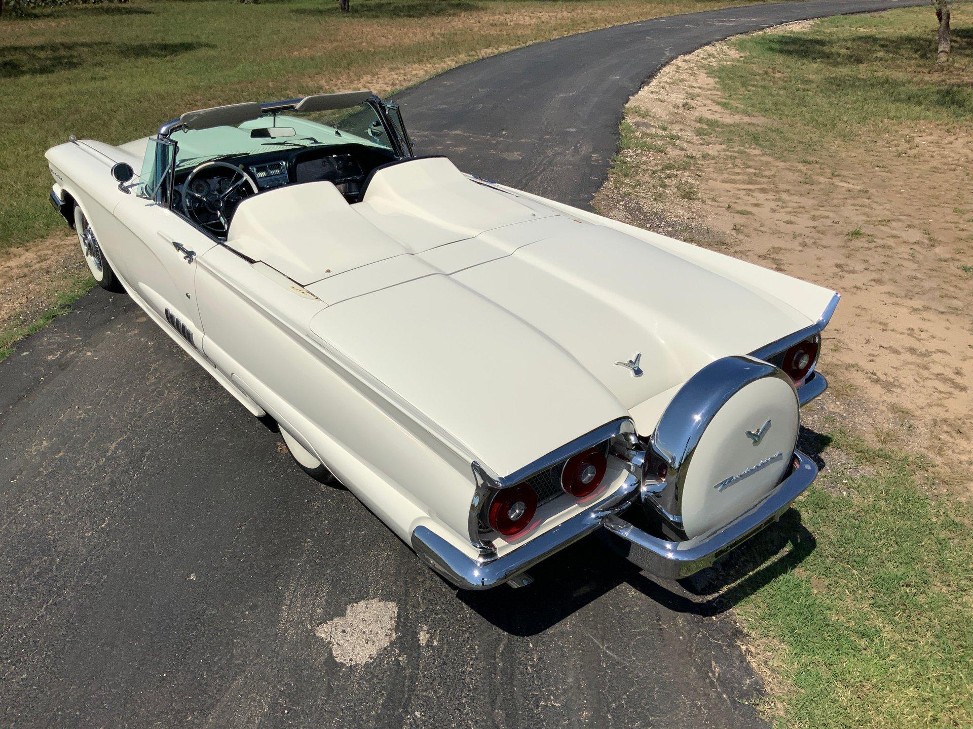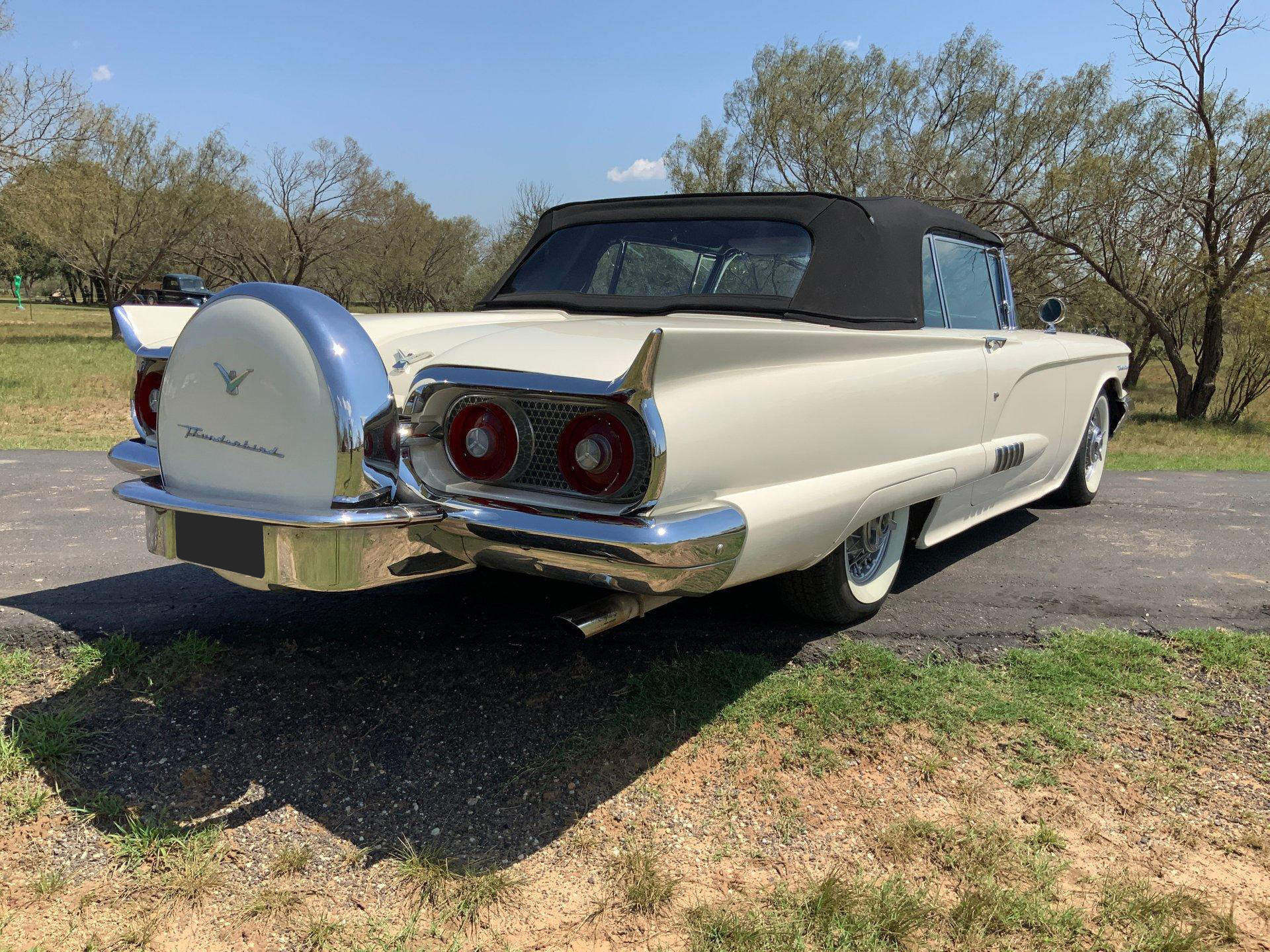 This Winterset White (B) 1958 Ford Thunderbird was actually the first 4-seat T-Bird, and the marketing department started using the term "personal luxury" vehicle. Lift the classic and functional scooped hood and you'll be greeted by a torque rich Ford 428 V8 that was swapped for the original 352. Additional features include power steering, power front disc brakes, power windows, power seats, power top, air conditioning, a stout C6 automatic transmission, dual exhaust, classy Continental Kit, console, new Haartz cloth top, fiberglass tonneau from the 1962 Sports Roadster, and wide whitewall tires (215/75R14) wrapped around Kelsey-Hayes-type wire wheels. This classic cruiser has plenty of power for highway driving and possesses more character in a single fender than a new car has in its entirety.