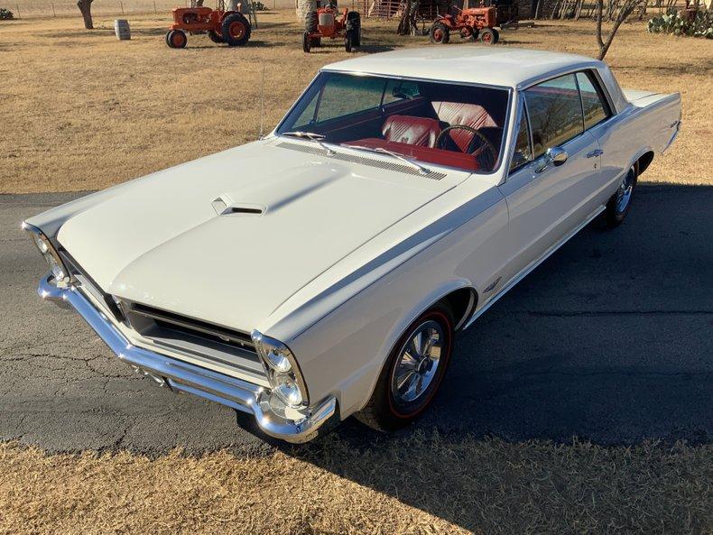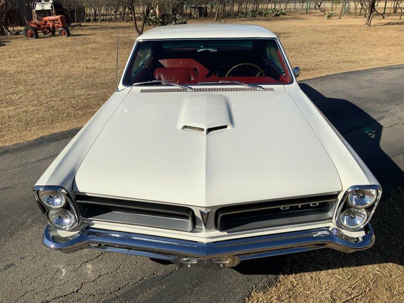 Our beautiful 1965 Pontiac GTO Hardtop is a terrific example of these legendary automobiles. Verified by Pontiac Historical Services documentation, this gem wears the correct Cameo Ivory (C-C) paint with red bucket seat interior (216-B) and retains its power steering, power brakes, air conditioning, and 389 ci V8 (BCN 9778789). Premium upgrades include a Tri-Power induction system, a Muncie 4-speed manual transmission in place of the Powerglide automatic, a new front disc conversion for the factory power brakes, and classic Hurst wheels wrapped in red stripe radial tires.