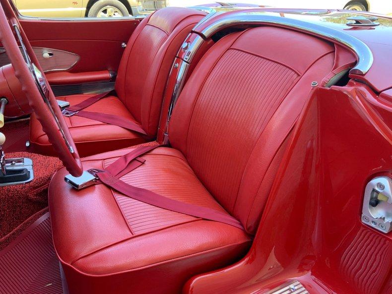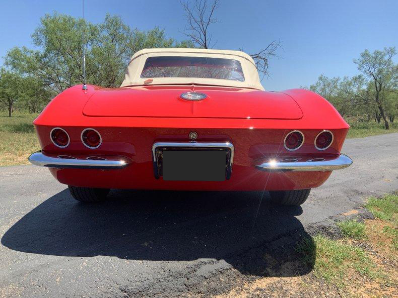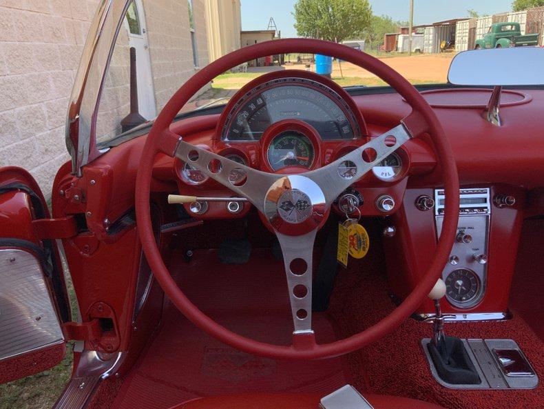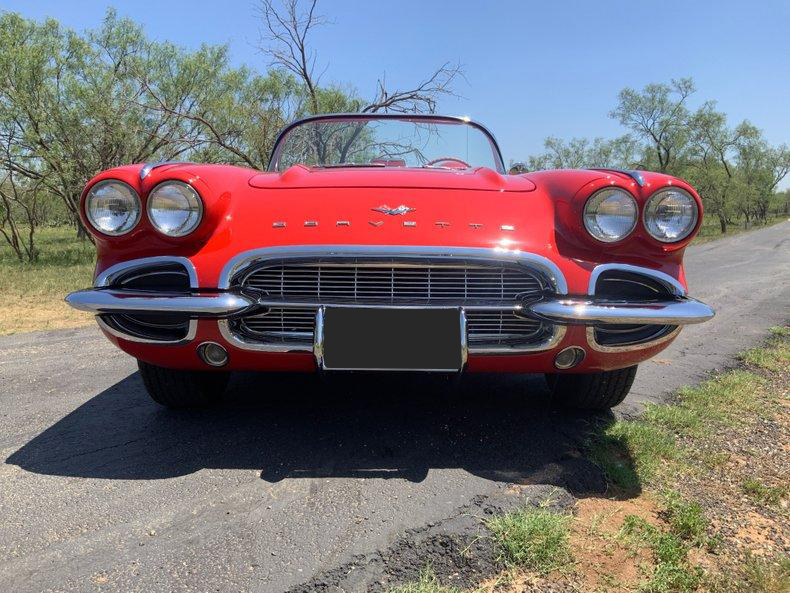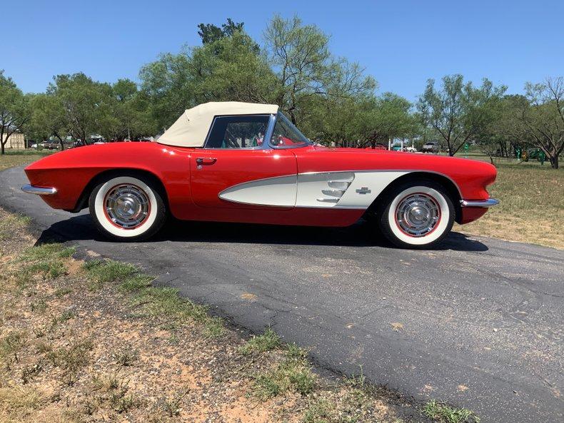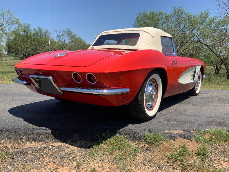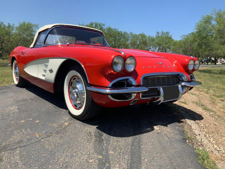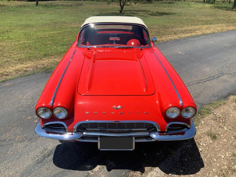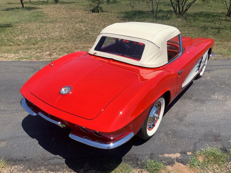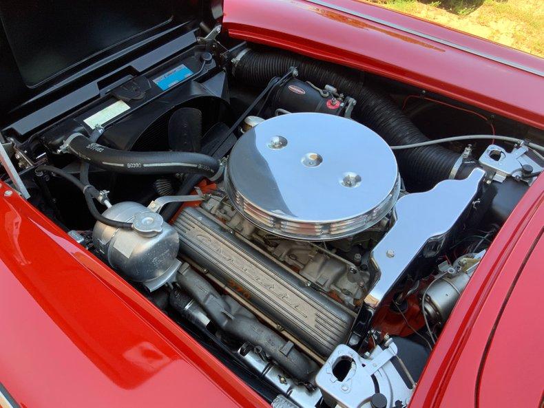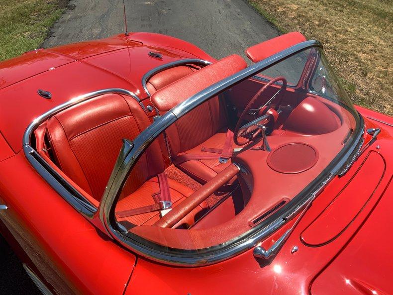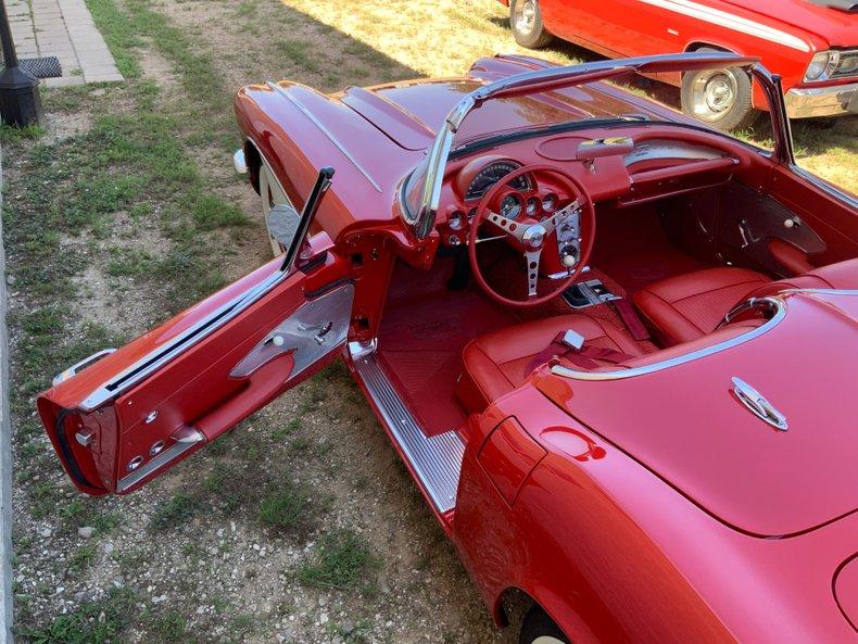 This 1961 Chevrolet Corvette has a 283ci V8 with two four-barrel carburetors and a new Dontov Cam with solid lifters. This combination makes for 270hp in this beautiful Roman Red convertible. The car has a Muncie 4-speed manual transmission with a heavy duty 427 clutch. This car has had a full nut bolt and everything in between restoration. The restoration took about 8 years. The starter, generator, gauges, and steering box were rebuilt. The car has a new aluminum Arrison radiator. All the Chrome has been re-plated. The paint has all been taken down to the fiberglass and repainted with the correct Roman Red even the wheels on the outside. The car has been outfitted with a '61 Corvette replica Wonderbar radio that will handle AM/FM as well as Bluetooth.