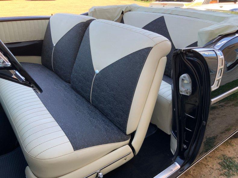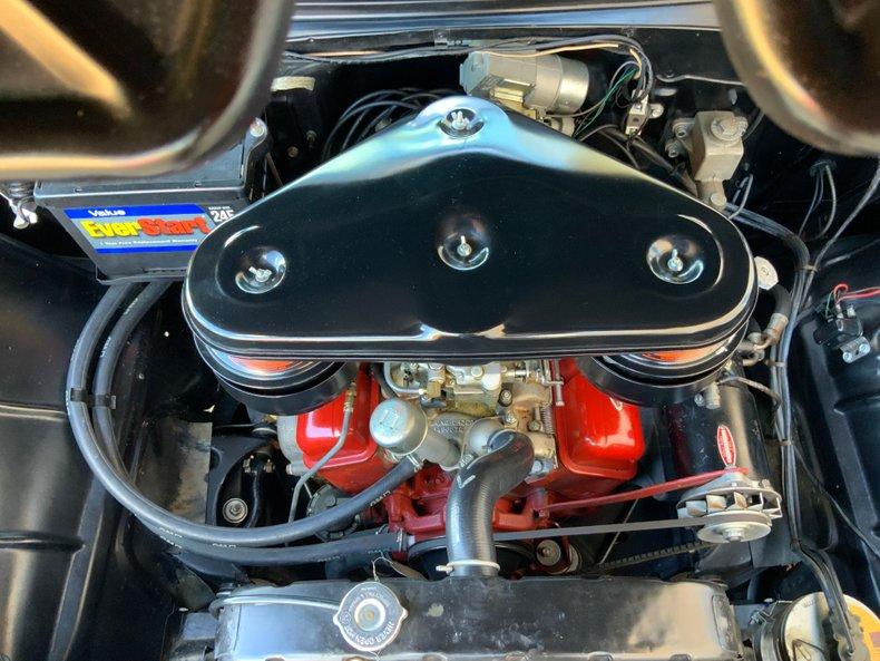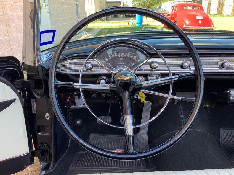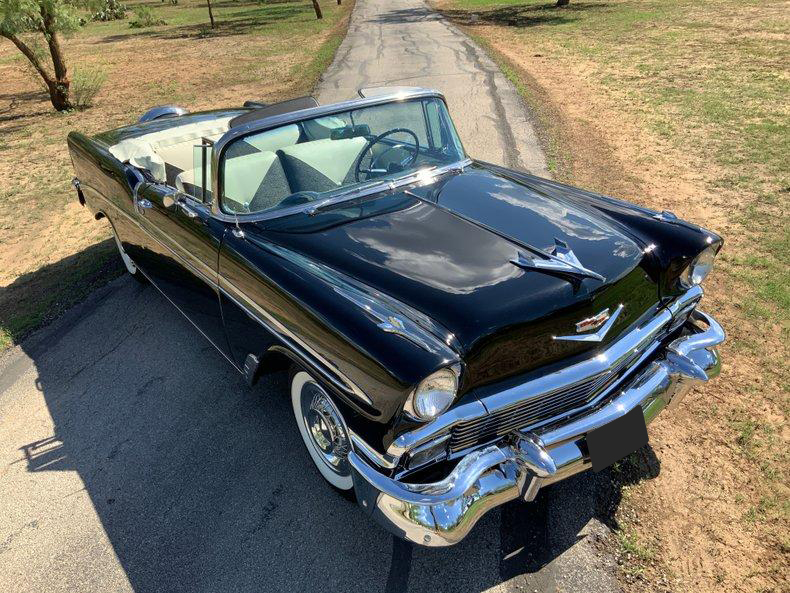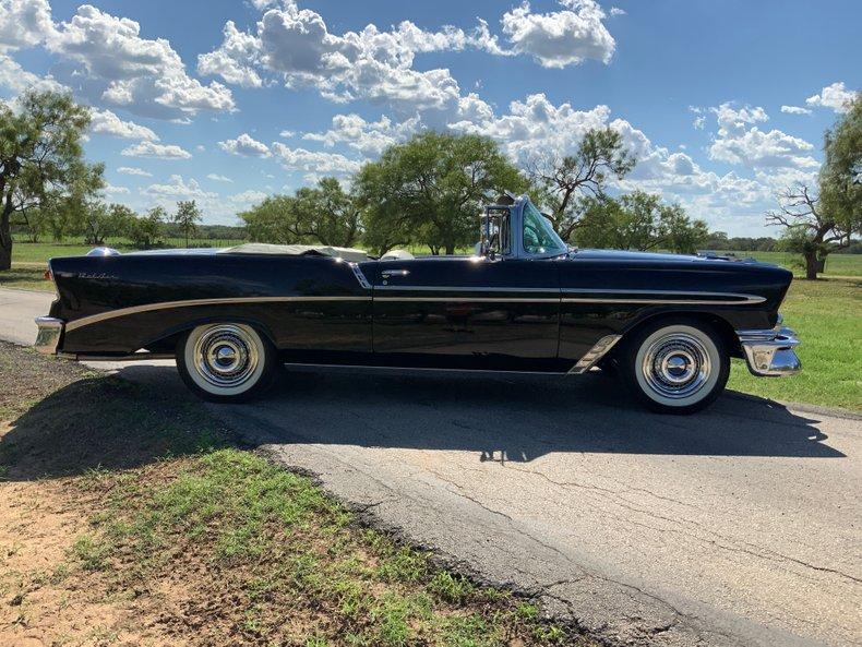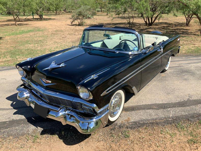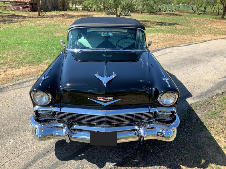 This stunning 1956 Chevrolet Bel Air Convertible (1067DTX) beautifully demonstrates the world-class styling and engineering that made these cars legendary. Beneath the hood is the correct (BCN 3720991) and beautifully restored 265 V8 that's sporting a correct (CN 3731394) Winters foundry aluminum intake manifold with dual Carter 4bbl carburetors and nestled under the imposing "batwing" air cleaner, one of the greatest conversation starters known to man! Additional features include correct Onyx Black paint (687), correct Ivory and Charcoal (602) trim, power steering, power top, 3-speed manual transmission, 3.70 rear gears (AA), dual exhaust, grille guard, Continental kit, fender skirts, and 205/75R15 wide whitewall tires on steel wheels with rare '56 wire wheel covers.
