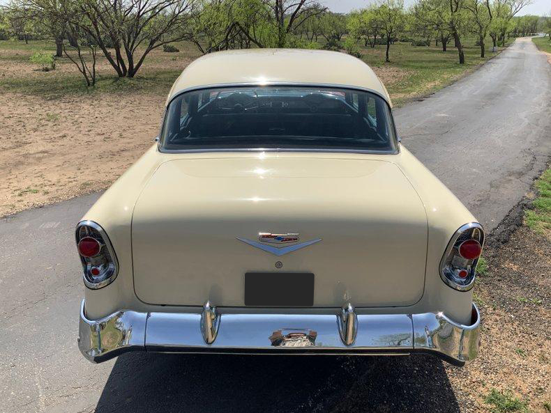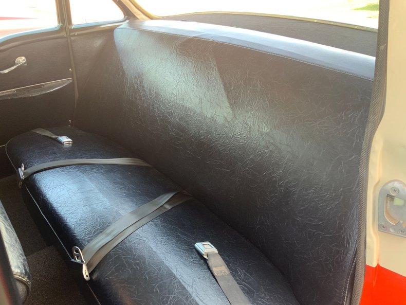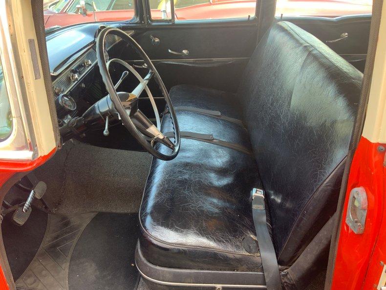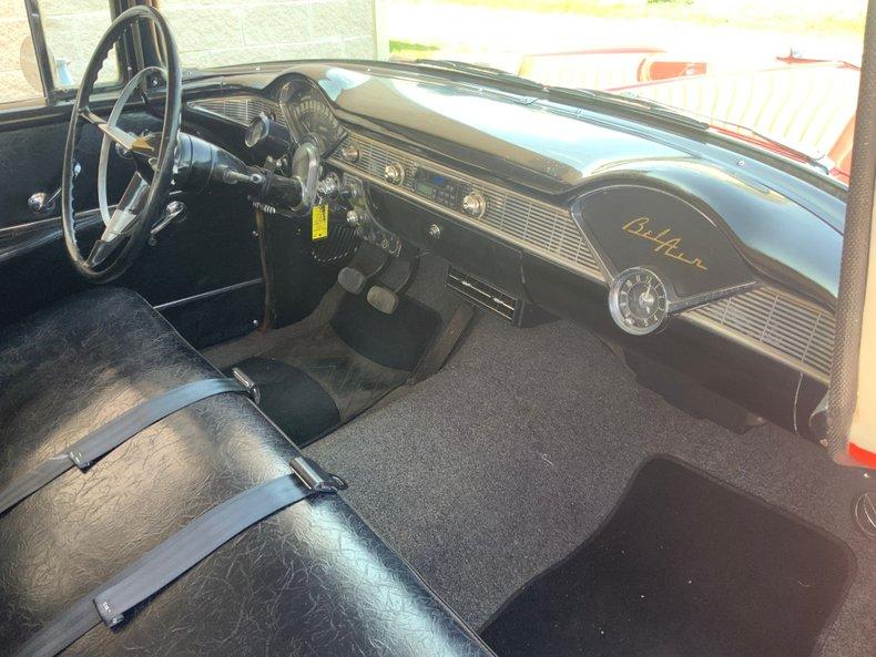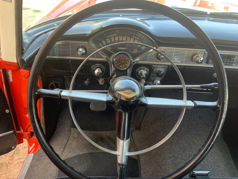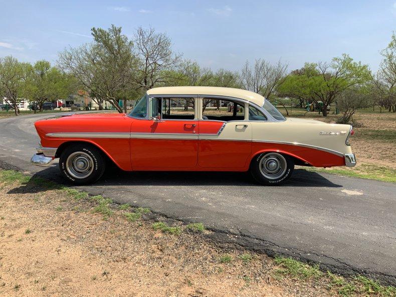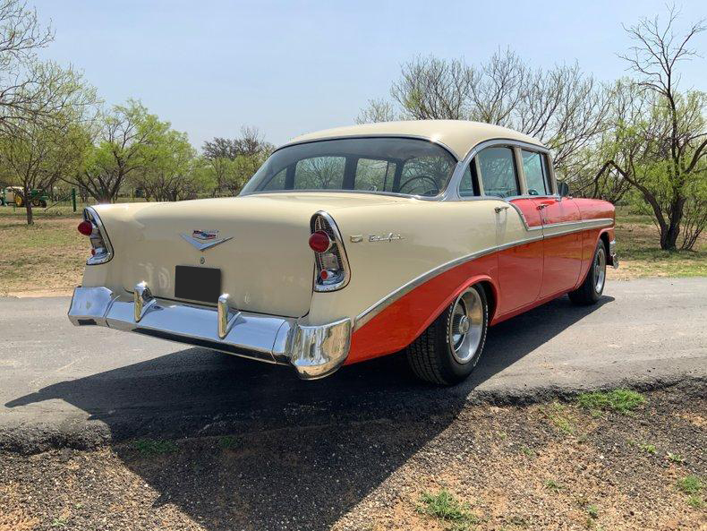 1956 Chevrolet Bel-Air Sedan painted in a Matador Red and India Ivory two-tone. This Bel-Air drives like a time capsule from the 50s with the 3 on the Tree and a very cush interior. Although antiquated, this car includes some modern features such as A/C and a radio/cassette player. A 305cui V8 paired to a 3-speed Synchromesh manual transmission powers this Bel-Air Sedan.