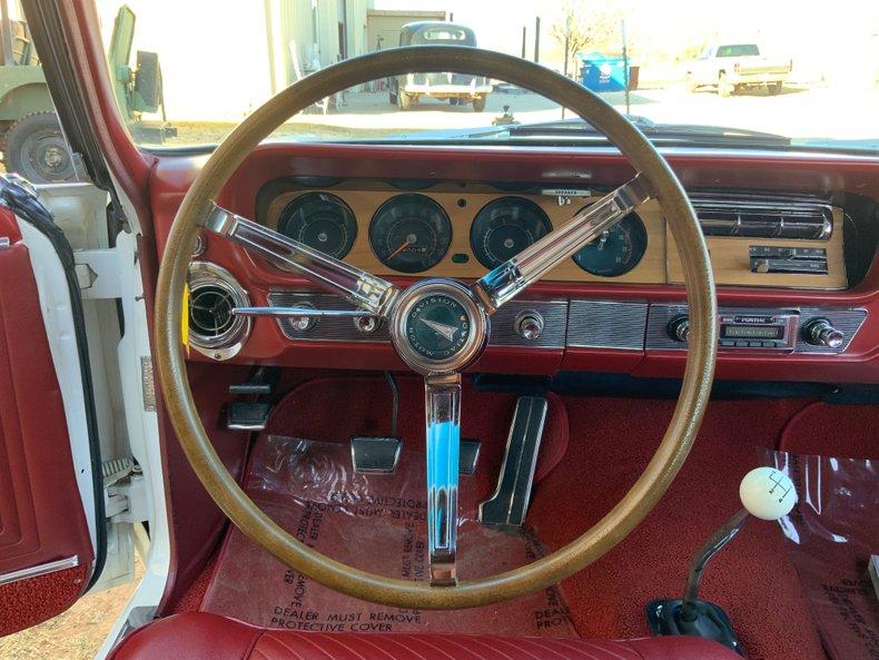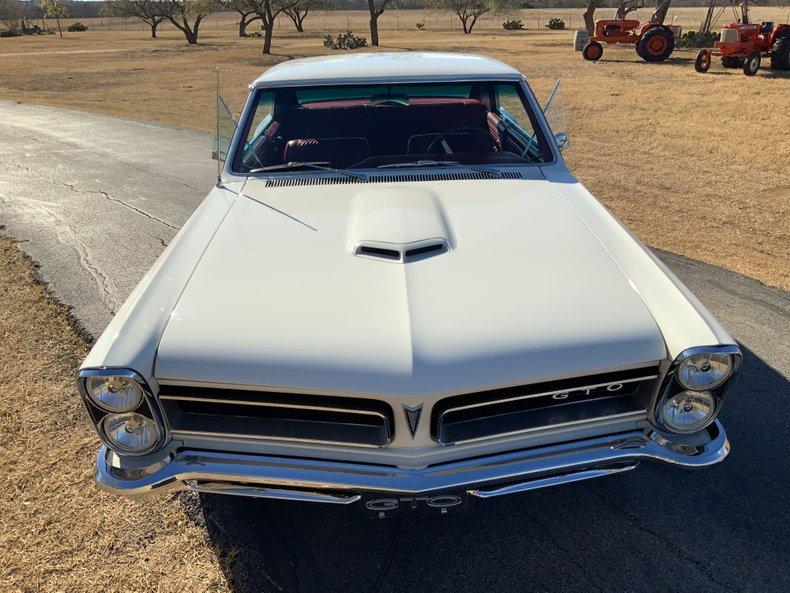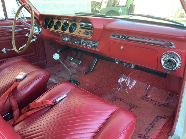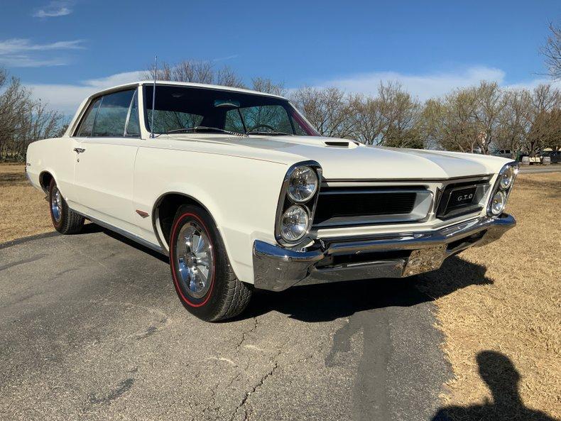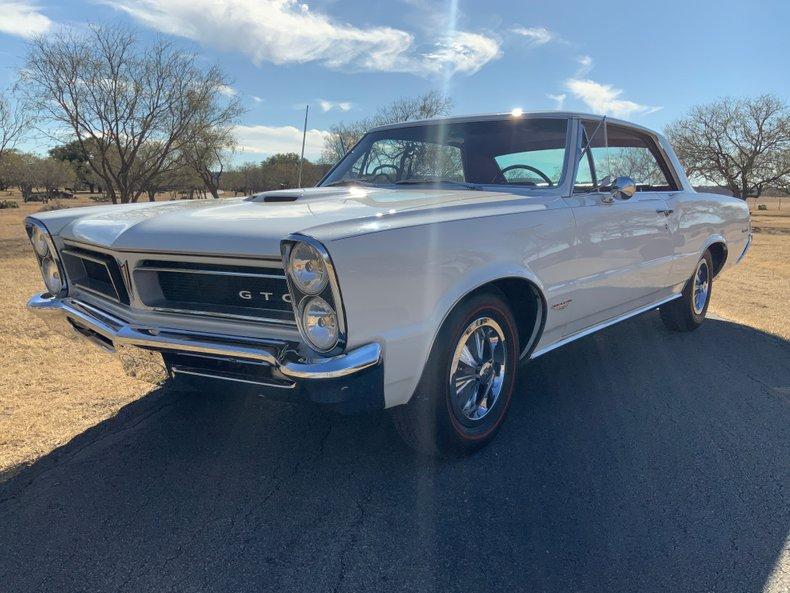 Our beautiful 1965 Pontiac GTO Hardtop is a terrific example of these legendary automobiles. Verified by Pontiac Historical Services documentation, this gem wears the correct Cameo Ivory (C-C) paint with red bucket seat interior (216-B) and retains its power steering, power brakes, air conditioning, and 389 ci V8 (BCN 9778789). Premium upgrades include a Tri-Power induction system, a Muncie 4-speed manual transmission in place of the Powerglide automatic, a new front disc conversion for the factory power brakes, and classic Hurst wheels wrapped in red stripe radial tires.
